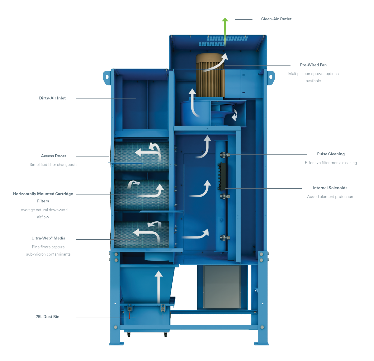 With its more efficient cartridge filters and advanced downward airflow, the DFPRE 2 and 3 require fewer filters for the same filtration power, resulting in: